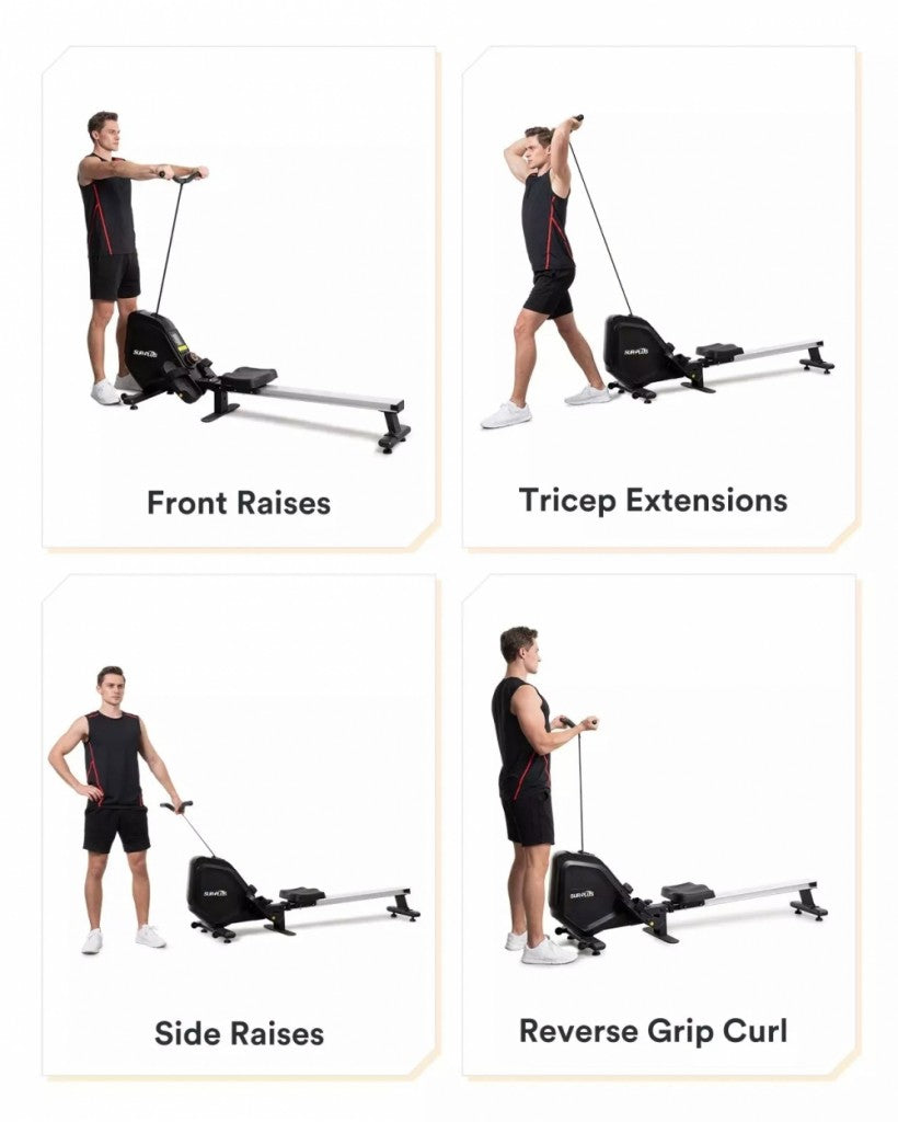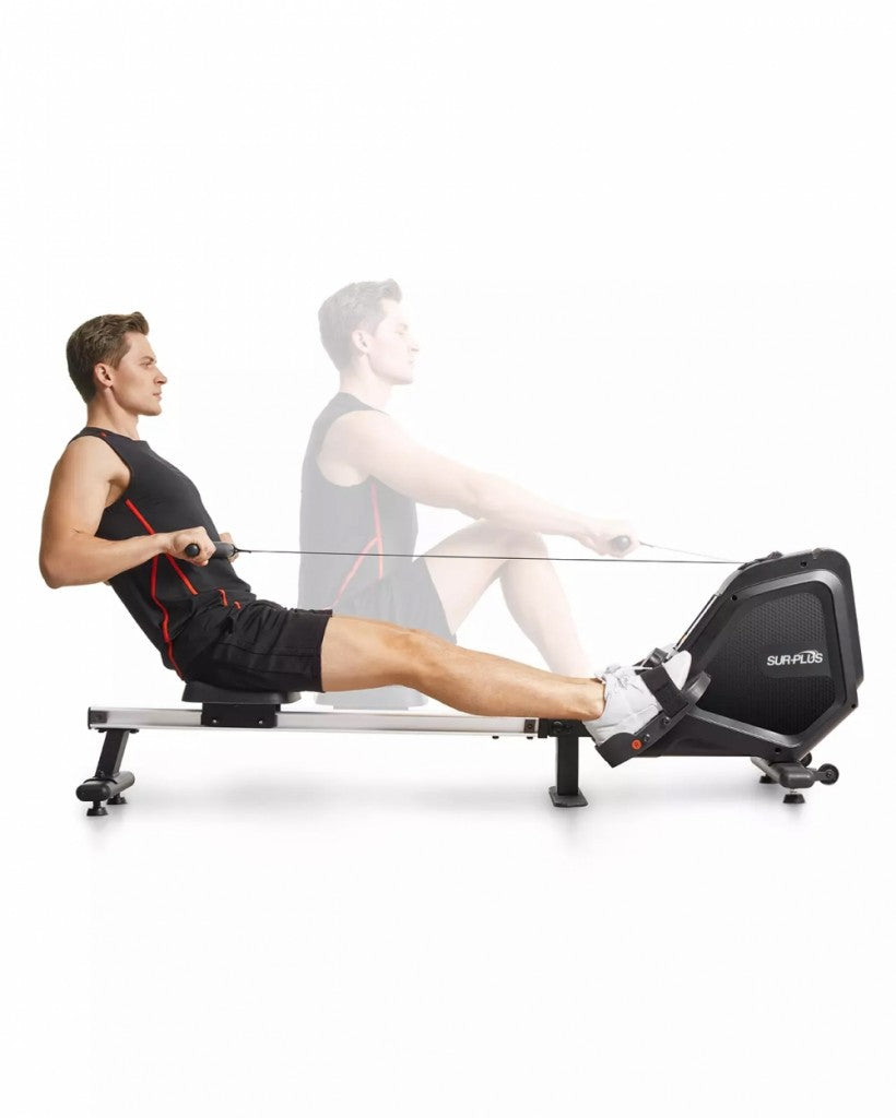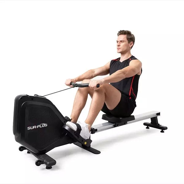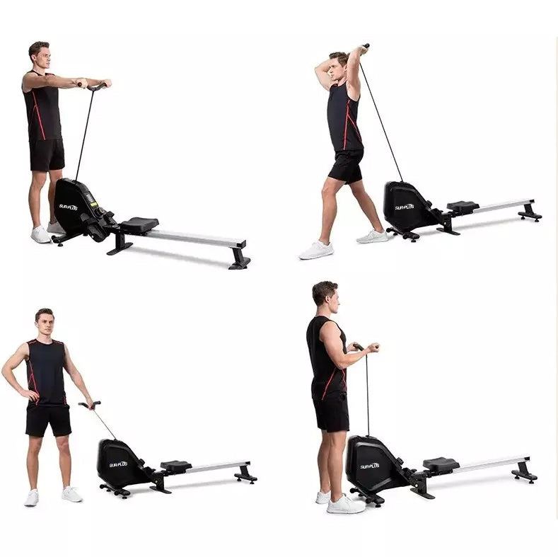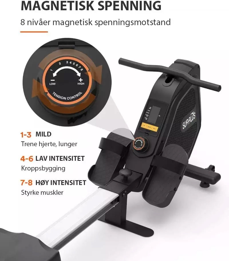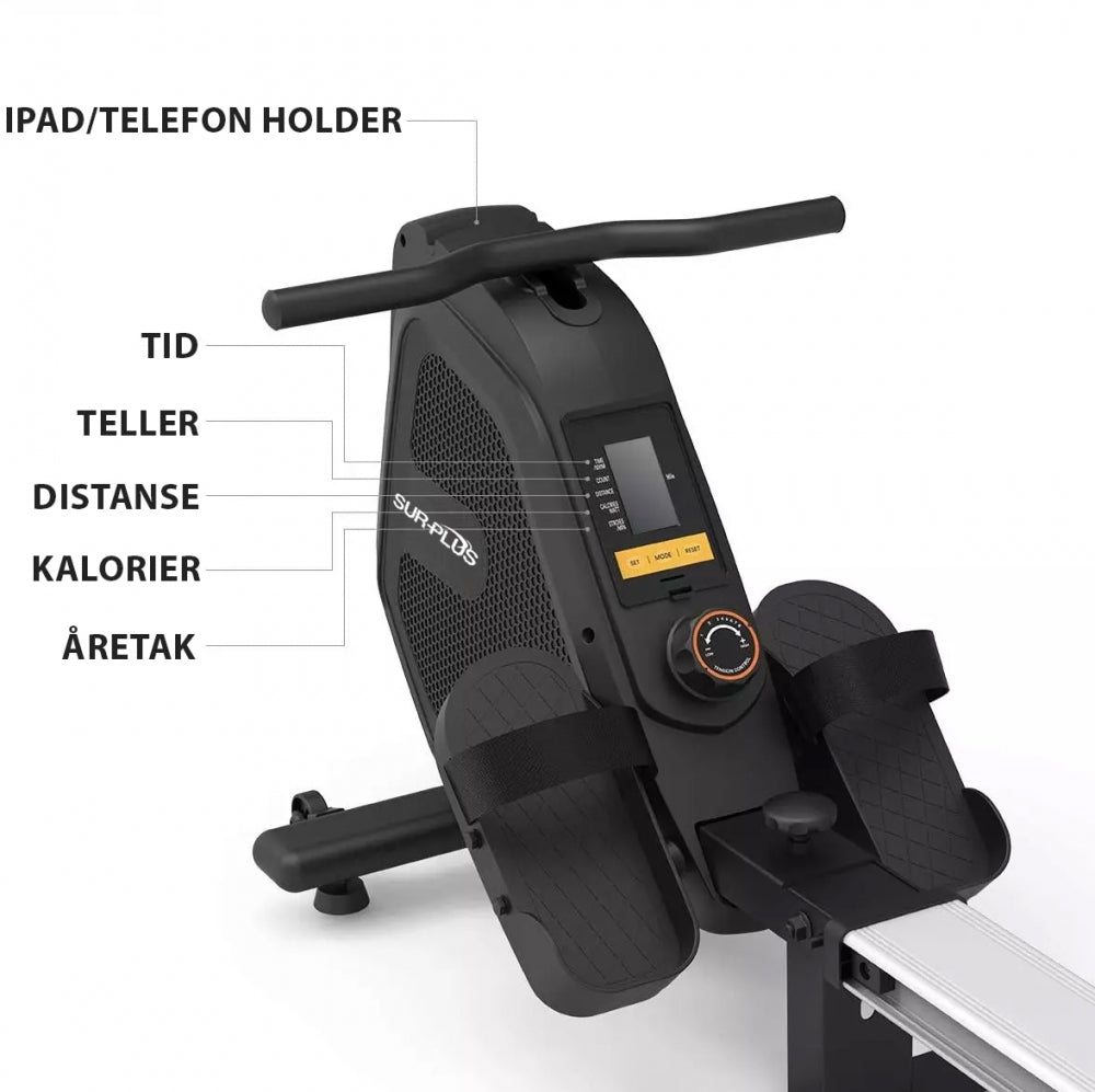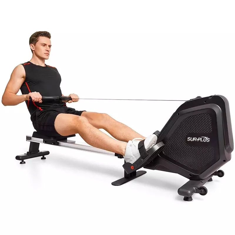 Surplus romaskin har 8 forskjellige magnetiske motstandsnivåer. I tillegg til roing kan du utføre styrkeøvelsene triceps extension, front raise, side raises og reverse grip ved hjelp av rokabelen. Surplus Romaskin er stillegående og enkel å montere. Surplus romaskin er plassbesparende da du enkelt kan brette den sammen etter avsluttet treningsøkt. Hjulene gjør at du kan trille den bort og plassere den på egnet sted. Romaskinen har også Ipad/telefonholder i front. En monitor med LCD skjerm viser tid, distanse oppgit i kilometer (K), kalorier og antall "åretak".
